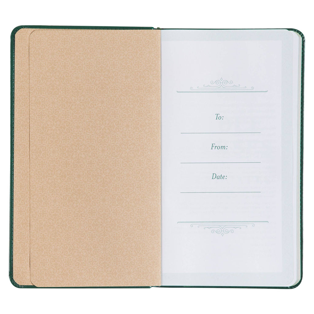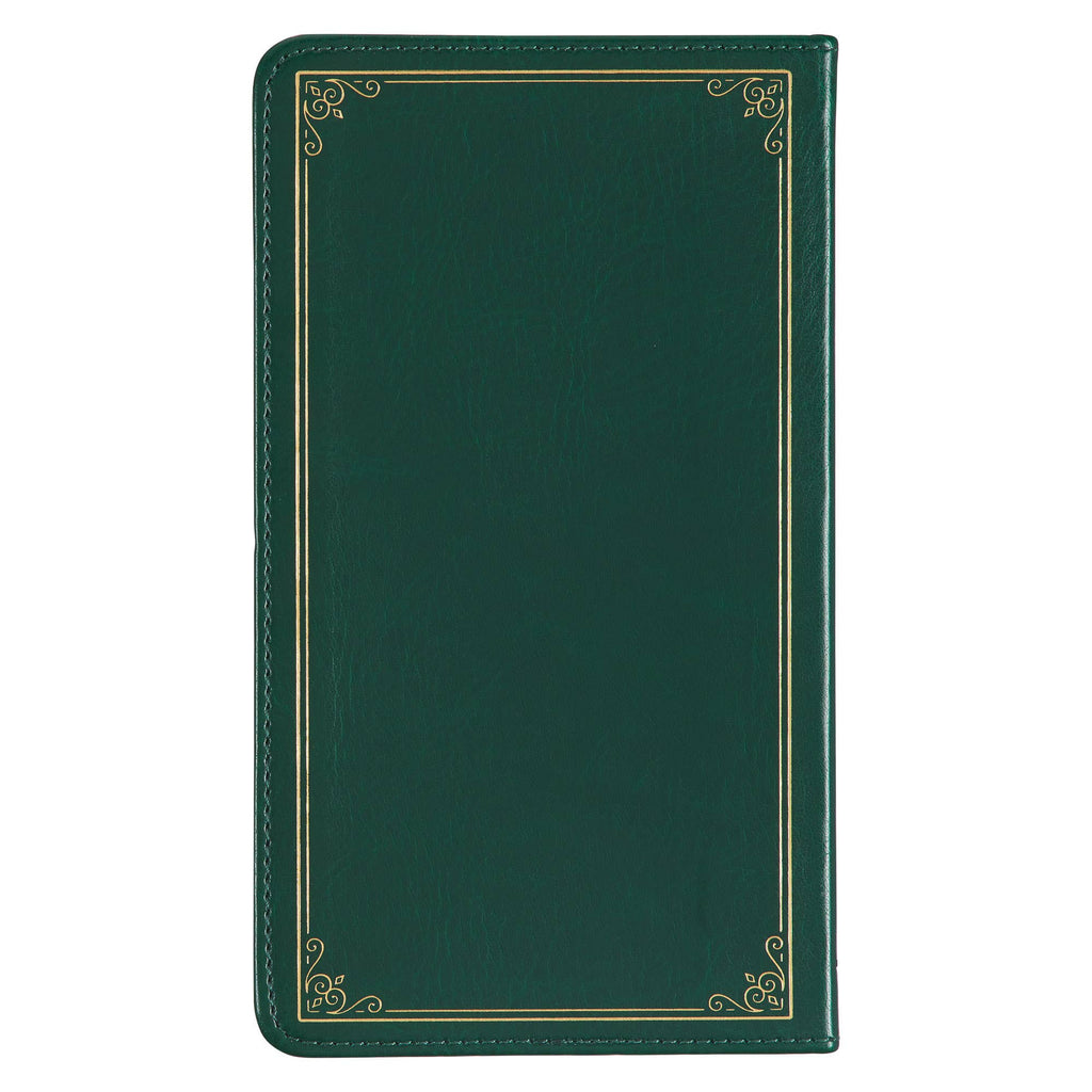 Celebrate your graduate's remarkable achievements and memorable moments with the 199 Favorite Bible Verses for Graduates Green Faux Leather Gift Book. This devotional book serves as a testament to their hard work while reminding them of the ultimate measure of success—an authentic relationship with the Father. Green cover with gold-foiled frame design, Green faux leather, Softcover, Gilt-edged pages, Ribbon marker, 199 handpicked verses and quotes, One-color interior, Lined pages for adding own verses and notes, 128 pages, Size: 7.3" x 4.2" x .4" (185 x 107 x 10mm)