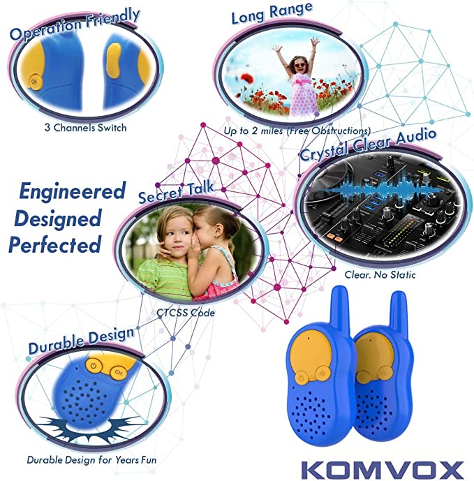 Komvox Children's Walkie Talkies are a great toy for kids with up to 5 miles and 3 separate channels. Great for children in the same neighborhood or siblings in the same house. Have fun anywhere with these Walkie Talkies!